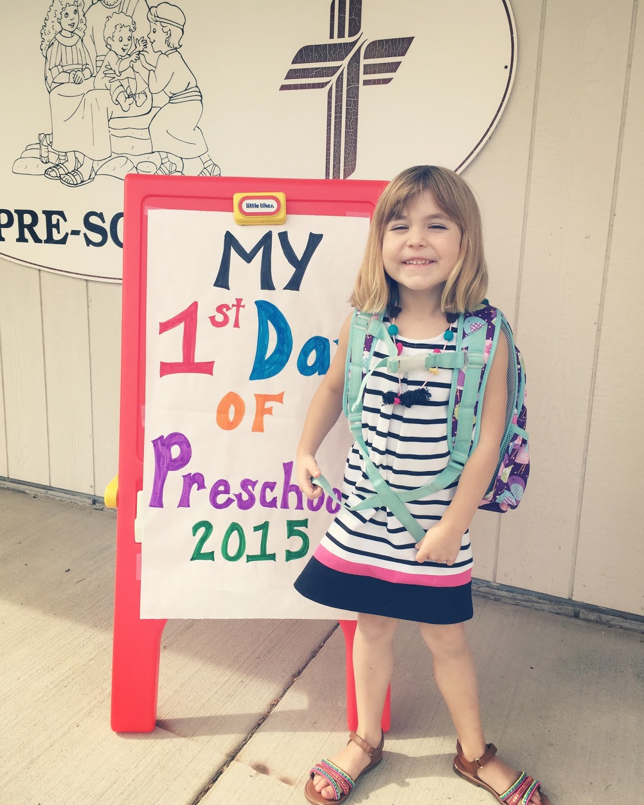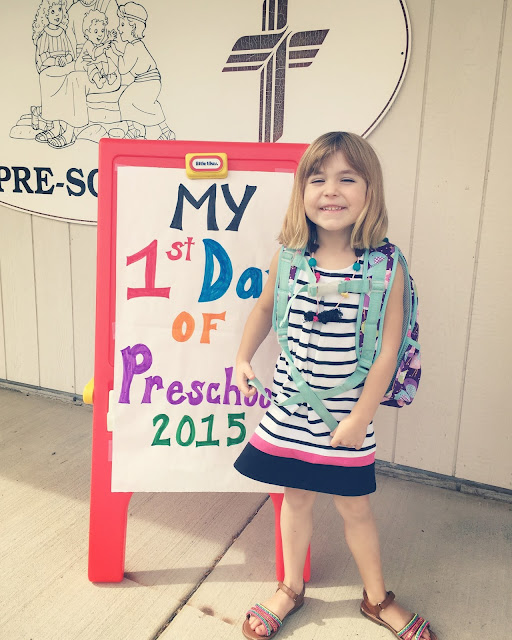 We forgot to hold up of "first day" sign at home. Luckily, the preschool had us covered! Charlotte was a bit under the weather the first few days of school so her smiles were a bit -shall we say - forced!?