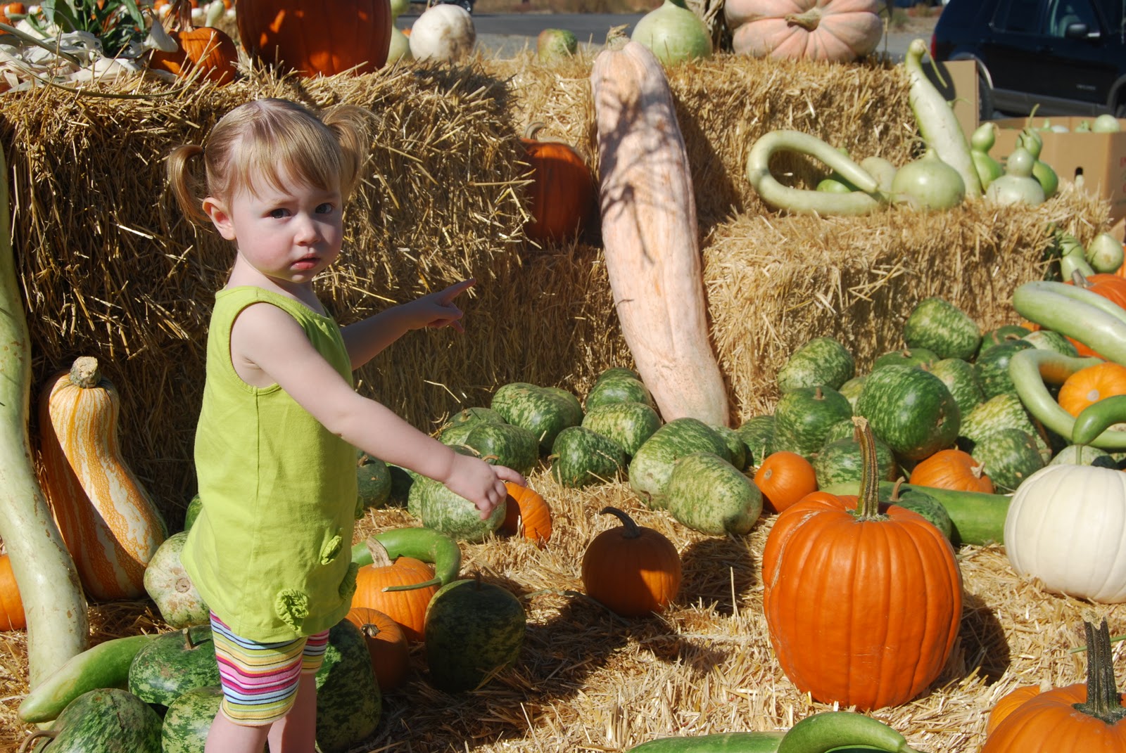 Yes, the perfect pumpkin is green and shaped like an apple. You can tell by her facial expression that she is THRILLED to have finally found it!